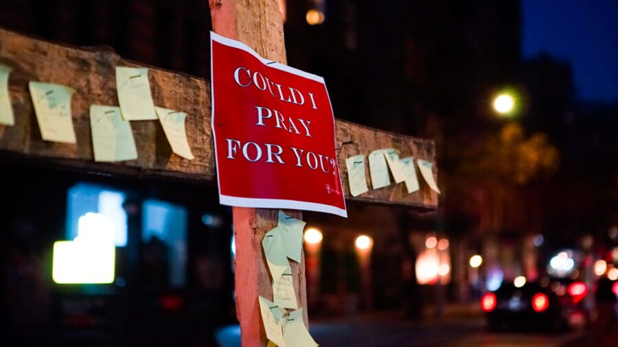 “Hey, we’re the only stand out here that isn’t charging you a dime. We’re giving away God. For free! Just come on over to our cross here and write down your prayer!”
